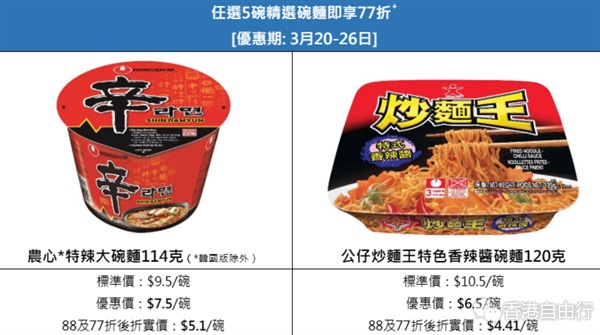 3月20日至26日期间,任选5款精选碗麵还能享额外77折,可与3月21日门市买满$168「全场88折」快闪优惠同步使用,实行折上再折!优惠期内货品种类包罗万有,把握时机来扫货吧!