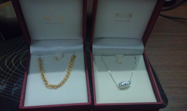 左边给老爸的项链,右边给妈妈的,婆婆的已经拿走了,她很开心的呢