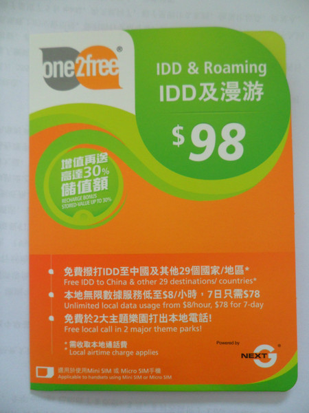 【手机卡】在香港有必要开通一个手机卡,推荐one2free,淘宝上面有,这个卡的优势就是可以7天不限3G流量,而且还可以往大陆打电话,发短信,特别方便。迷路的时候找个地图、挂个QQ、发个微博,特别好。