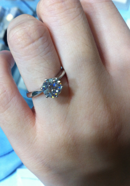 钻石我在“Bluefine”购买。小小的店铺在“炮台山”,老板娘人好赞,很热情。说把他们家的东西当自己家的,随便试戴,哈哈,好可爱。最后还送了一盒排很长队才能买到的鸡蛋卷。总体来说,钻石购买比较顺利,性价比也比内地高很多,裸钻比较放心,看得到GIA上的瑕疵,我买的是1.01 F SI1 3EX None,戒托是18k白金的(价格私聊)。取货时,老板娘会给我们核对钻石上的镭射码,是否和证书上的一致。