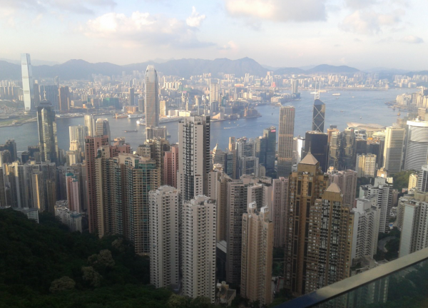 然后五点多的时候坐上小巴,前往太平山顶。对于小巴司机的车技!!!我真的是五体投地啊啊啊!!香港的路都好小,2个车道的车交错的时候真的会感觉要撞一起去了。。上山顶的路弯又多,可是司机一整个非常淡定。。我们倒是吓得不轻。。感觉不抓紧把手就分分钟要被甩出去似的。。。到了山顶后真真是整个人都神清气爽了~