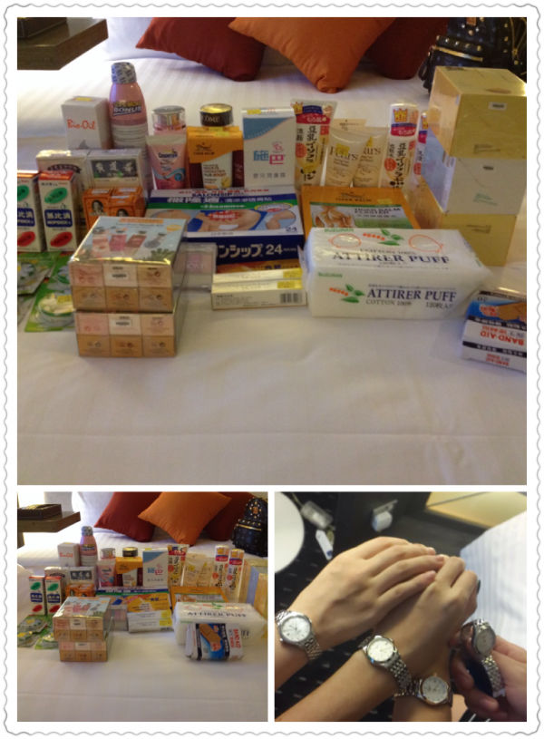 饱餐之后就在对面的金英大药房买了需要的药品和护肤品,又到附近的莎莎、龙城补了一下货,由于去的时候是周五,店里人并没有传说中的人挤人,我们也懒得比价了就在金英基本搞定了一些东西。本来LZ是冲着心月系列去的,到了那儿试戴之后发现太厚实了,完全不适合,表行人员就给推荐了军旗系列的,带上觉得挺漂亮的,结果发现不去的表姐让带的就是这款,果断跟工作人员说要两只。表姐和表妹也纠结了很久,最后一起买了3只外加帮带了1只,总共4只,给了一个满意的折扣,军旗系列的比杭州专卖店便宜近3000RMB,一下子就把两个人的机票钱赚回来了。本来打算跟老公买个情侣表,结果他看了一圈没喜欢的,就放弃了,说是给我省点钱买喜欢的,偷笑,好老公啊。表盒由表行帮忙寄回来了,一周内就收到了,神速啊!手表带了一周越看越喜欢