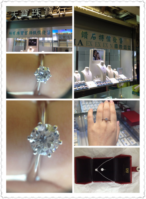 喝完早茶去早就定好的BLUE家买闪闪,之前在内地周大福看过一颗60分、D-E色、VVS的标价要4万6,表示压力很大,香港周大福虽然有便宜,但觉得还是不划算,所以买钻戒果断选择裸钻。一早关注了BLUE家的微信和官网,发现裸钻真的便宜太多了,而且有GIA的证书保证,本人对牌子什么的追求不大,省钱才是王道。在地铁炮台山站下车后B口出,沿英皇道右拐直走,直到看到渣打银行和一块天宝珠宝行的牌子,与地铁出口在同一侧,需要走过渣打银行后,在它的边上的一个小道拐进去,就能看到珠宝行了。我们是在天宝珠宝行的牌子指示下进去的,结果在里面饶了下弯还问了其他店主才找到。宫先生和老板娘都在,店里当时没其他客人,直接跟老板说了我想要的4C和预算,他又给推荐了几款,最后敲定62分、D色、VVS2、3EX、NONE,老板给了很满意的折扣,眉开眼笑了!内地看过一些钻戒,LZ表示比较注重颜色,必须是最顶尖的颜色,拿着其他颜色就一眼能看出哪颗更好,选择62分一是为了纪念我们6月2日相识,二是没有太多积蓄买更大的了。戒托就选了最经典的六爪。