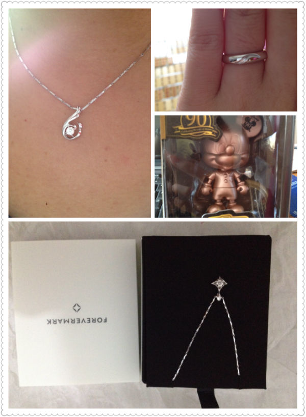 时代广场逛完后就回到佐敦,提前有看好迪士尼和周大福合作的对戒,还能送给公仔,让许先生帮忙留了尺寸,非常简单的一款戒指,看着挺大方的,老公也很喜欢。另外在店里买了两条18分、H色、VS1和19分H色、VS1的钻石吊坠送给妈妈和婆婆,再配了两根铂金项链,买到的东东很满意,项链送给妈妈她很喜欢。