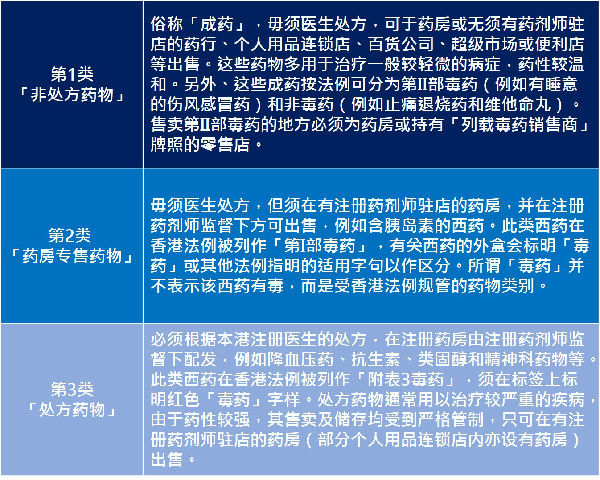 香港出售的药物一般可分为「西药」及「中成药」,西药按销售的管制可分为三大类: