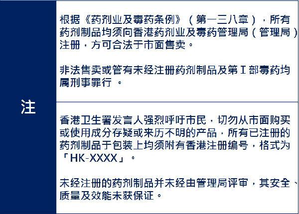 根据香港法例,所有西药必须获批注册方可在本港销售或分销。所有注册西药的标签上必须附有西药注册编号(样式为「HK-XXXXX」)。